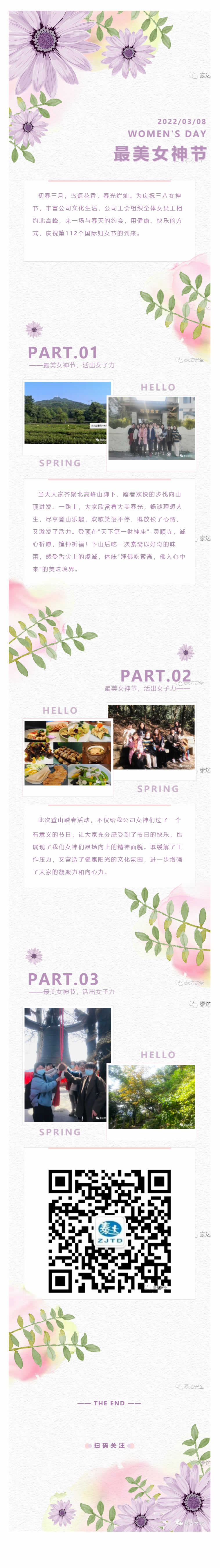 初春三月,鳥語花香,春光爛燦。為慶祝三八女神節,豐富公司文化生活,公司工會組織全體女員工相約北高峰,來一場與春天的約會,用健康、快樂的方式,慶祝第112個國際婦女節的到來。